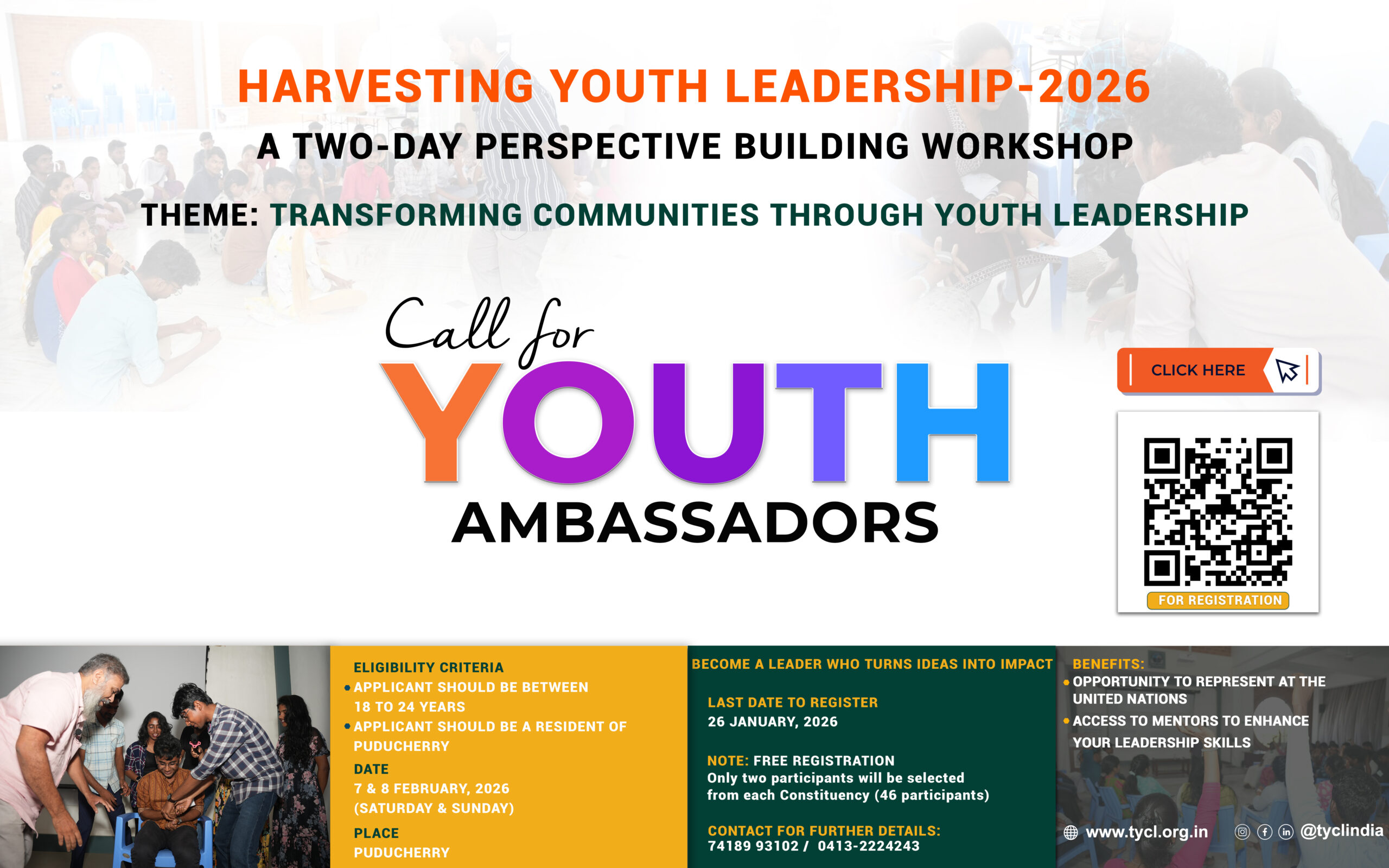 Ready to lead change? Join Harvesting Youth Leadership 2026, a powerful two-day workshop on February 7–8 for young people in Puducherry aged 18–24. You will learn to solve community problems, build leadership skills, and receive expert mentorship to turn your ideas into action. This is your chance to become a “Youth Ambassador” for your area and earn an official certificate. Don’t wait—applications close on January 25, 2026. Register now and start your journey as a changemaker!
